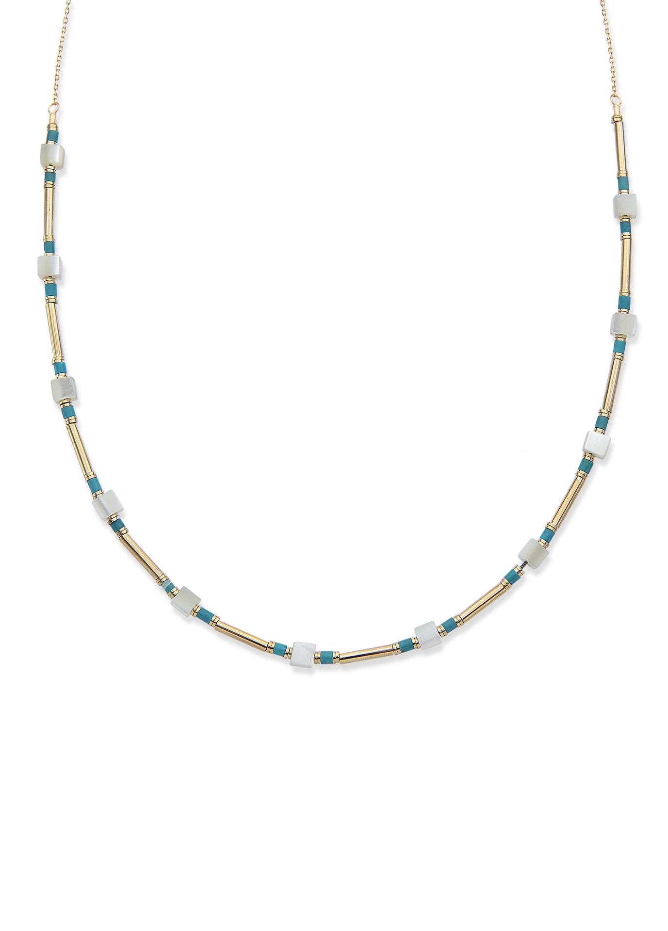Turkuaz tonların ferahlatıcı enerjisi ve beyaz taşların sade zarafeti, Aqua Muse Kolye’de modern bir dengeyle buluşuyor. Altının sıcak ışıltısı ile serin mavi tonların kontrastı, tasarıma hem sakin hem de dikkat çekici bir karakter kazandırır. Günlük stilinize rafine bir dokunuş katarken, yaz akşamlarından şehir şıklığına uzanan çok yönlü bir kullanım sunar.