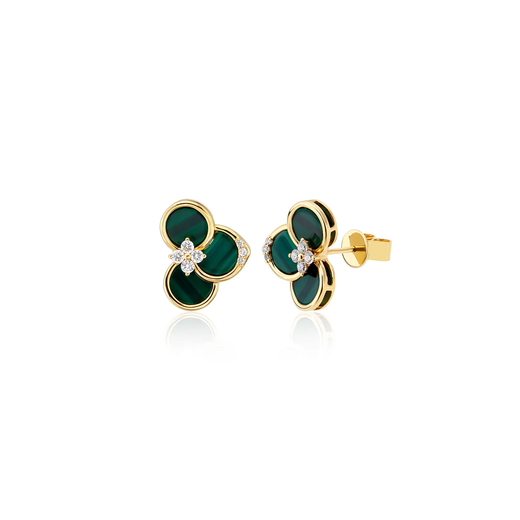 Minimalist ve modern silüetiyle Bloom Malakit Küpeler, doğanın yeniden doğuşunu simgeliyor. Çiçek yaprağı şeklindeki Malahit taşı, 0,24 karat pırlanta ve 18 ayar sarı altın.