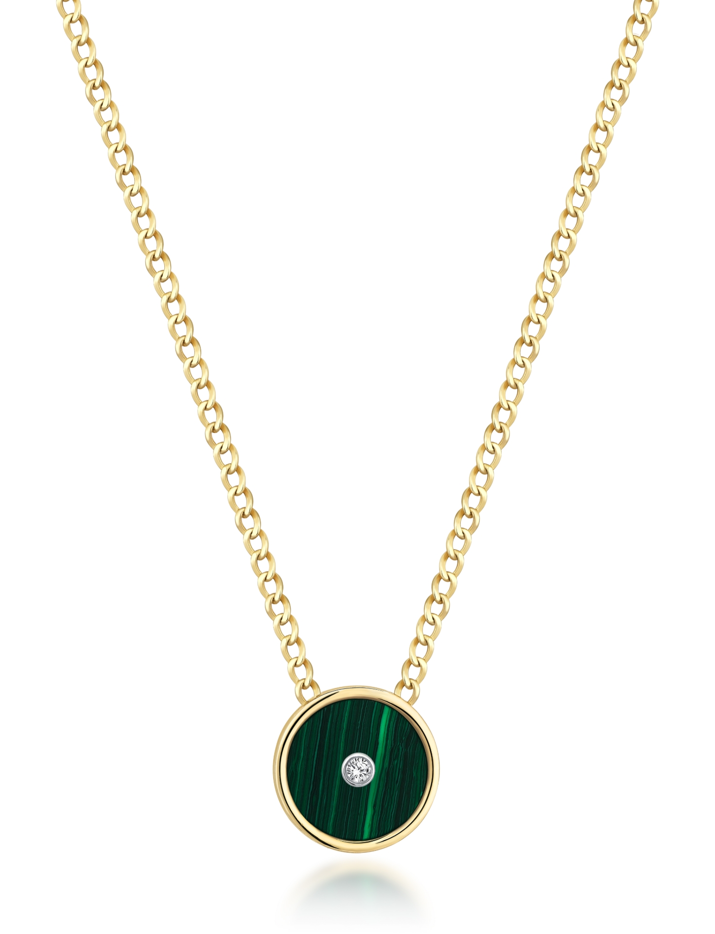 Link Malakit & Pırlanta Kolye, dönüşümü, korunmayı ve içsel gücü simgeleyen malakit taşının canlı yeşil tonlarıyla öne çıkıyor. Kalbinde yer alan parlak pırlanta detayı, her hareketle ışığı yansıtarak tasarıma zamansız bir parıltı katıyor.