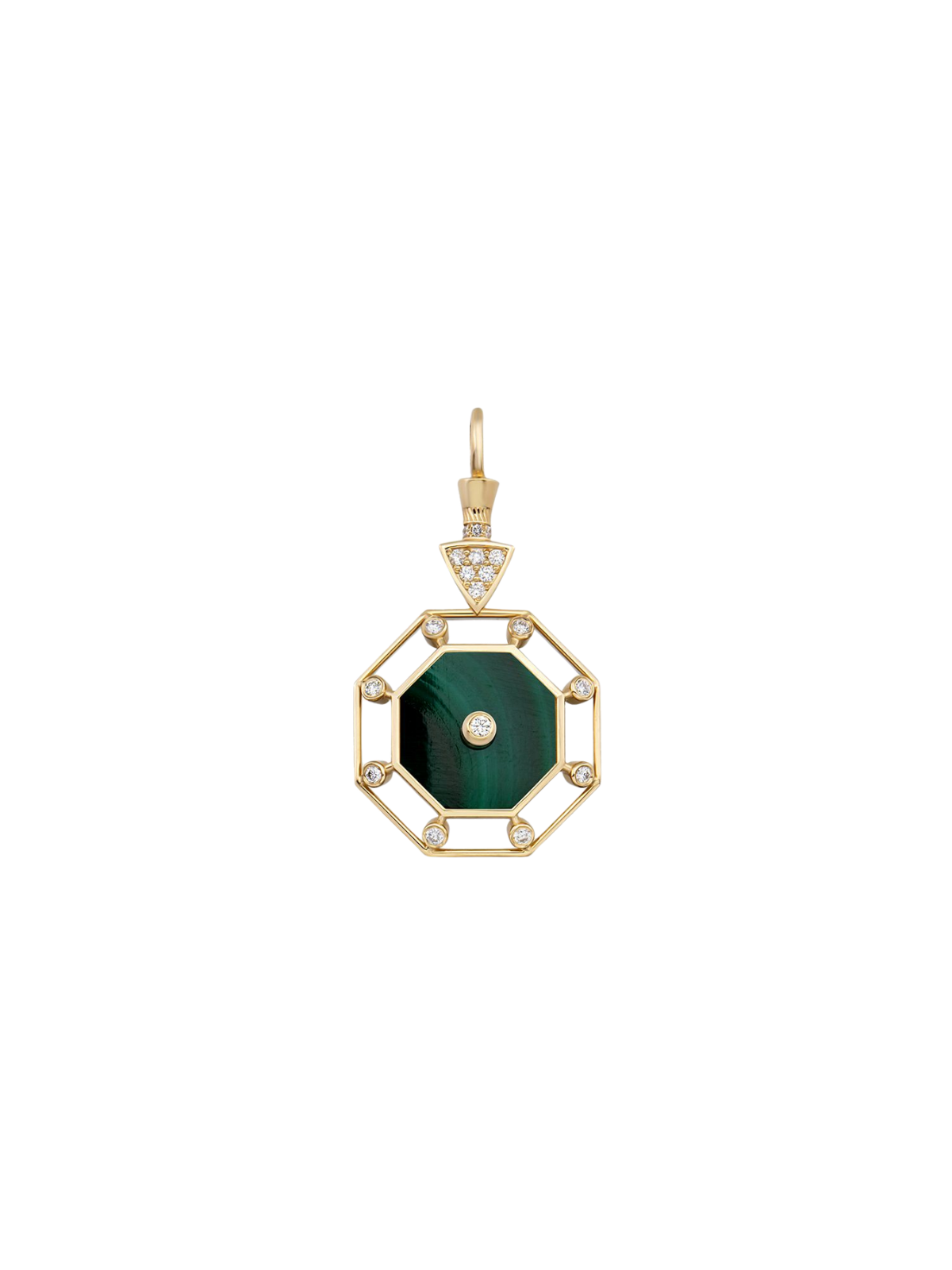 Bu kolye ucu, 14 ayar altından yapılmış sekizgen bir silüete sahip olup, ortasında çerçeve içine yerleştirilmiş bir pırlanta bulunan ışıltılı bir malahit taşını çerçeveliyor.