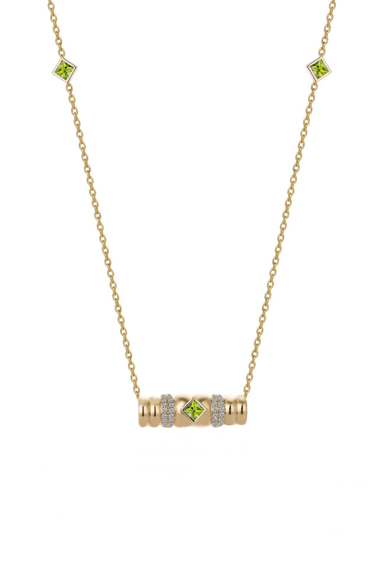 Morphose02 Koleksiyonu'nun şık ve zarif bir parçası olan bu kolye, dönüşümün güzelliğini ve enerjisini yansıtır. Merkezde yer alan canlı yeşil peridot taşı, tazelik ve yenilenmenin sembolü olarak bilinirken, yanlarına zarifçe yerleştirilmiş pırlantalar, tasarıma sofistike bir ışıltı katıyor. Peridot taşı, canlandırıcı enerjisiyle ön plana çıkarken, tasarımın göz alıcı detaylarını tamamlıyor.