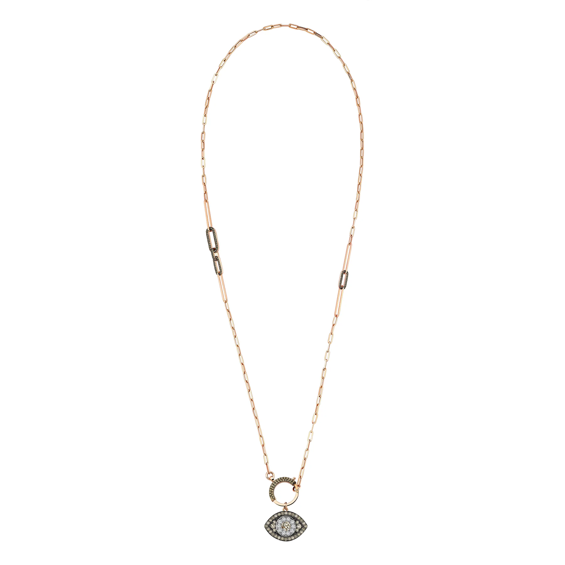 18 ayar pembe altından üretilen ve elmas ile kahverengi elmaslarla süslenmiş göz ve daire figürlü Nazar kolye, negatif enerjileri uzak tutar.