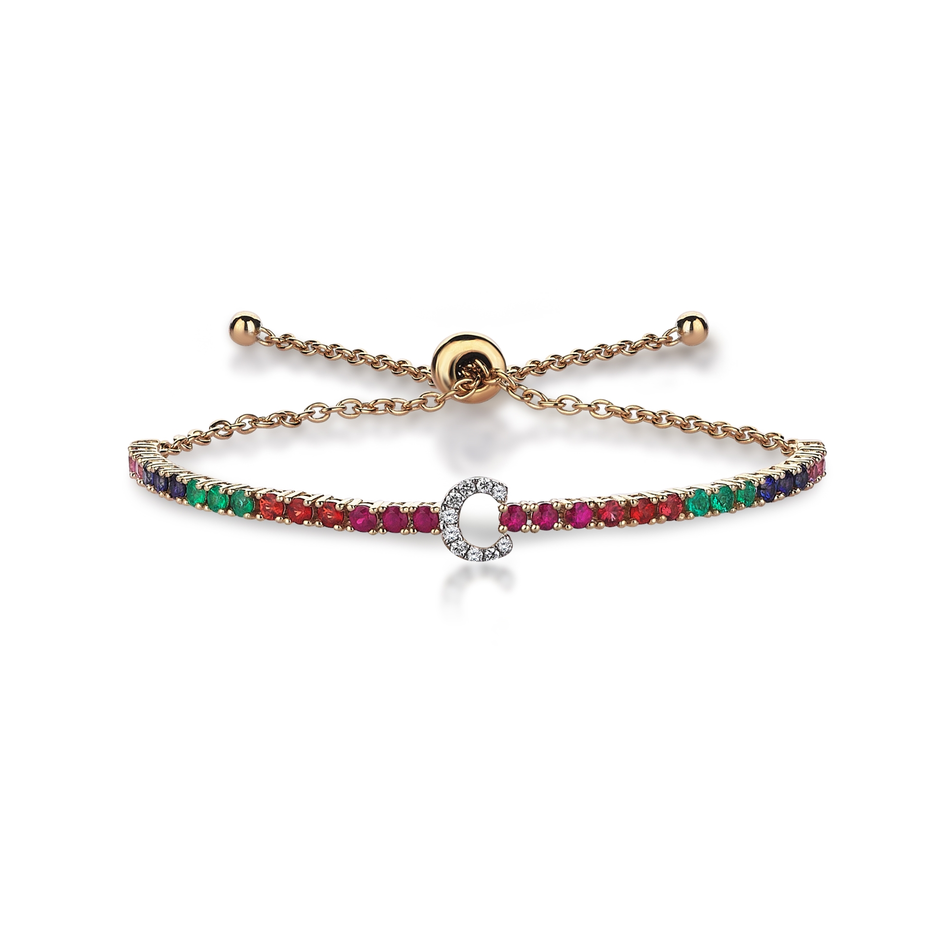 14 ayar altın Rainbow Pırlanta Harf Bilezik, gökkuşağının canlı renklerini yansıtan safir, zümrüt, yakut ve diğer değerli taşlarla süslenmiştir. Merkezde yer alan pırlanta kaplı. Merkezinde yer alan C harfi, kişisel bir dokunuş katarken, bileziğin zarif tasarımı her anınıza şıklık katıyor. Gökkuşağı, zorluklardan sonra gelen aydınlığı, umudu ve yeni başlangıçları simgeler.