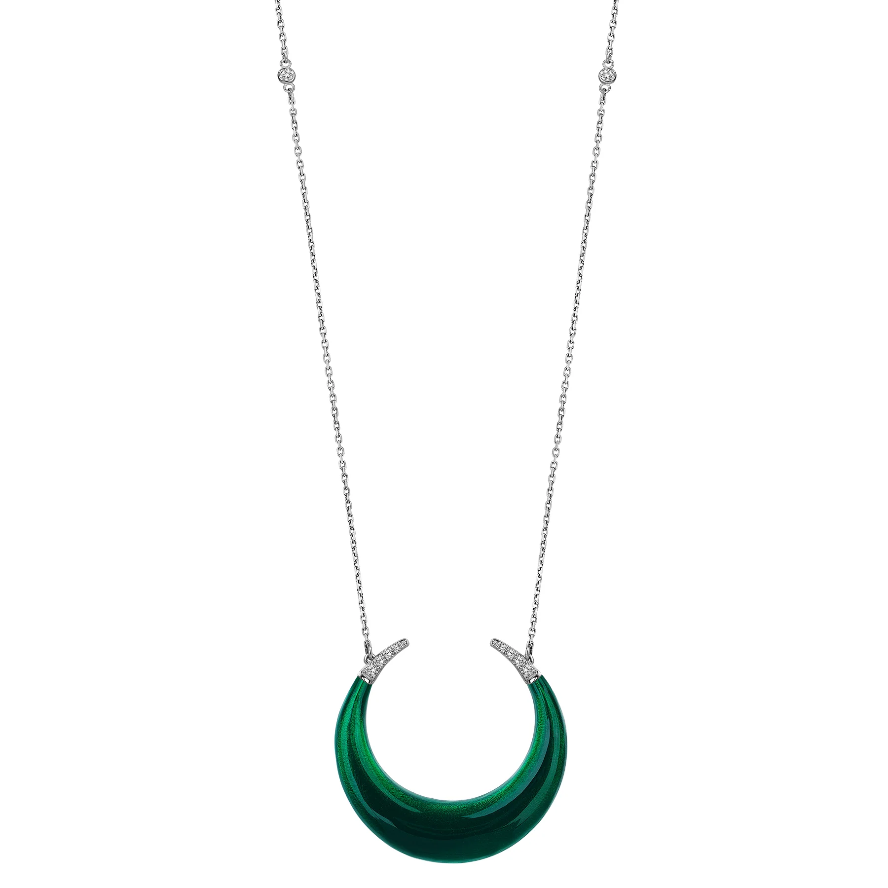 Yunan mitolojisindeki Ay Tanrıçası Selene'den ilham alan bu yukarı doğru hilal şeklindeki kolye ucu, uçlarında parıldayan mikro pırlantalarla süslenmiş yeşil mineden yapılmıştır.