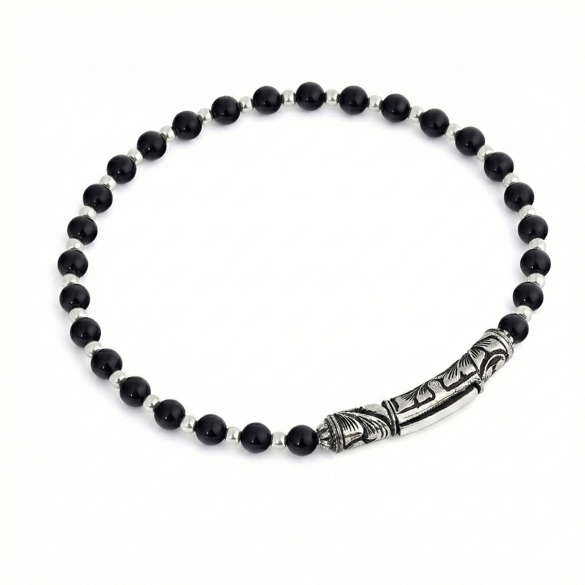 925 ayar gümüş, el oyması kalem işçilikli, 4mm oniks taşlı bileklik