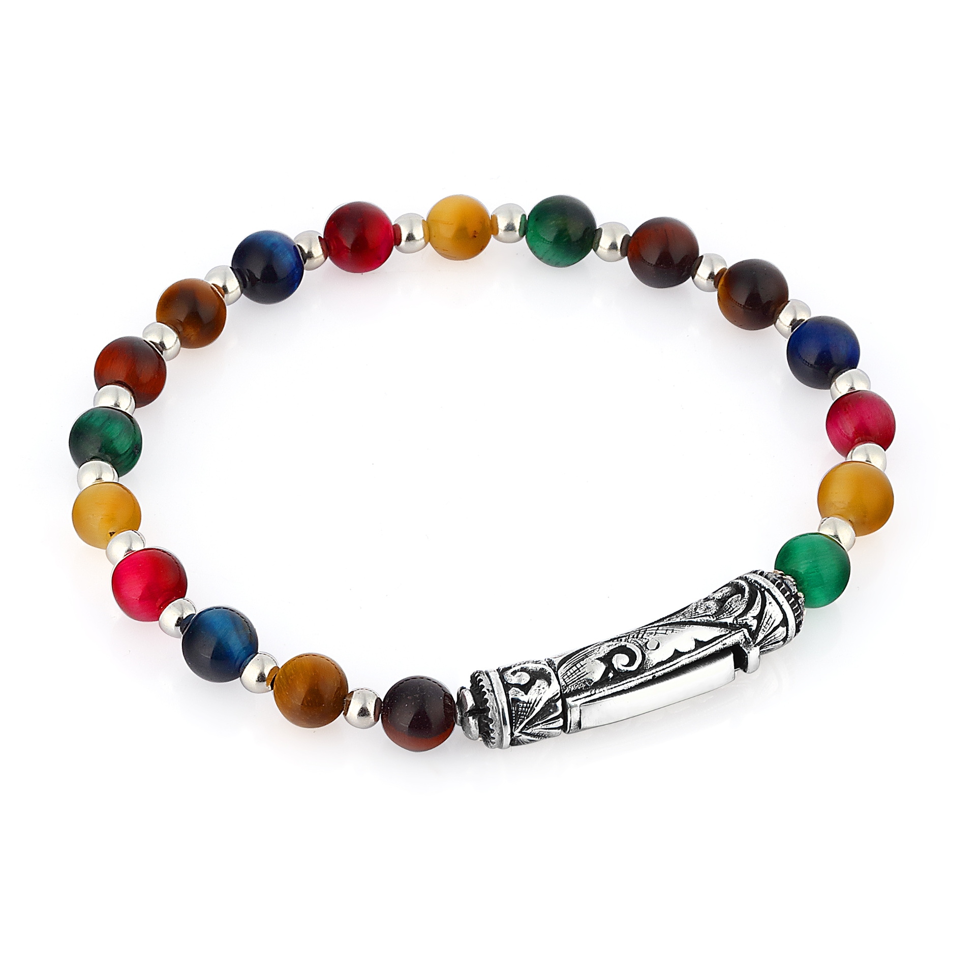 925 ayar gümüş, el oyması kalem işçilikli, 6mm çok renkli kaplan gözü taşlı bileklik