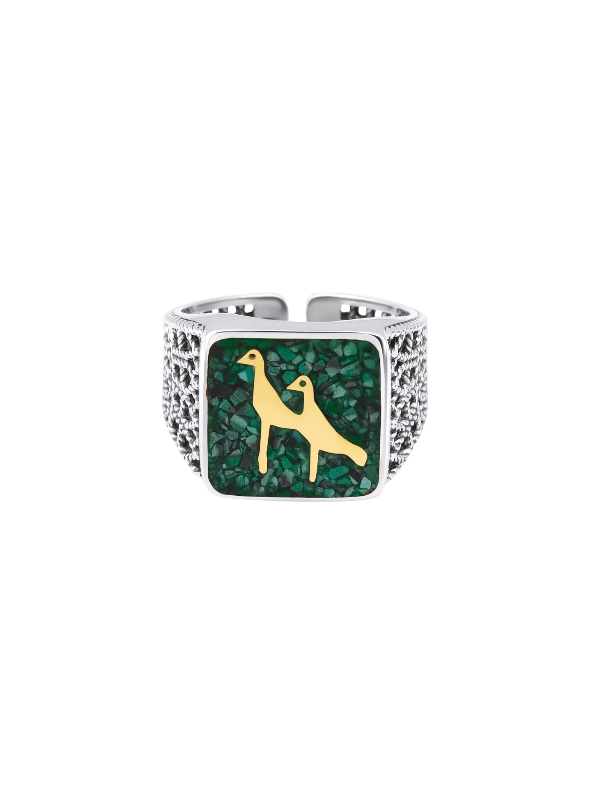 Turna: Antik dönem Bereket tanrıçası Demeter’in kutsal hayvanı Turna kuşu. Göç mevsimi, yeşermenin ve tohum atmanın zamanının geldiğini gösterir. Türklerde Gök Tanrı tasavvuru dışındaki ilahlardan biri olarak hikmet sahibi ruhu temsil ettiği kabul edilmektedir. Turnalar tek eşli olarak yaşarlar ve birlikte dans ederler. Gümüş, manevi saflığın simgesi koruyucu bir tılsımdır. Kötü enerjileri ve olumsuz düşünceleri uzaklaştırır. %100 geri dönüştürülmüş gümüş kullanılarak etik el işçiliğiyle üretilmiştir. Malakit, toprak enerjisini yükselterek negatifliğin yarattığı elektriklenmeyi bastırır. Negatif enerjileri ve radyasyonu insan bünyesinden uzak tutar. Ağrıları gidermek için kullanılır. Sakinleştirici özelliği ile uyumaya yardım eder.