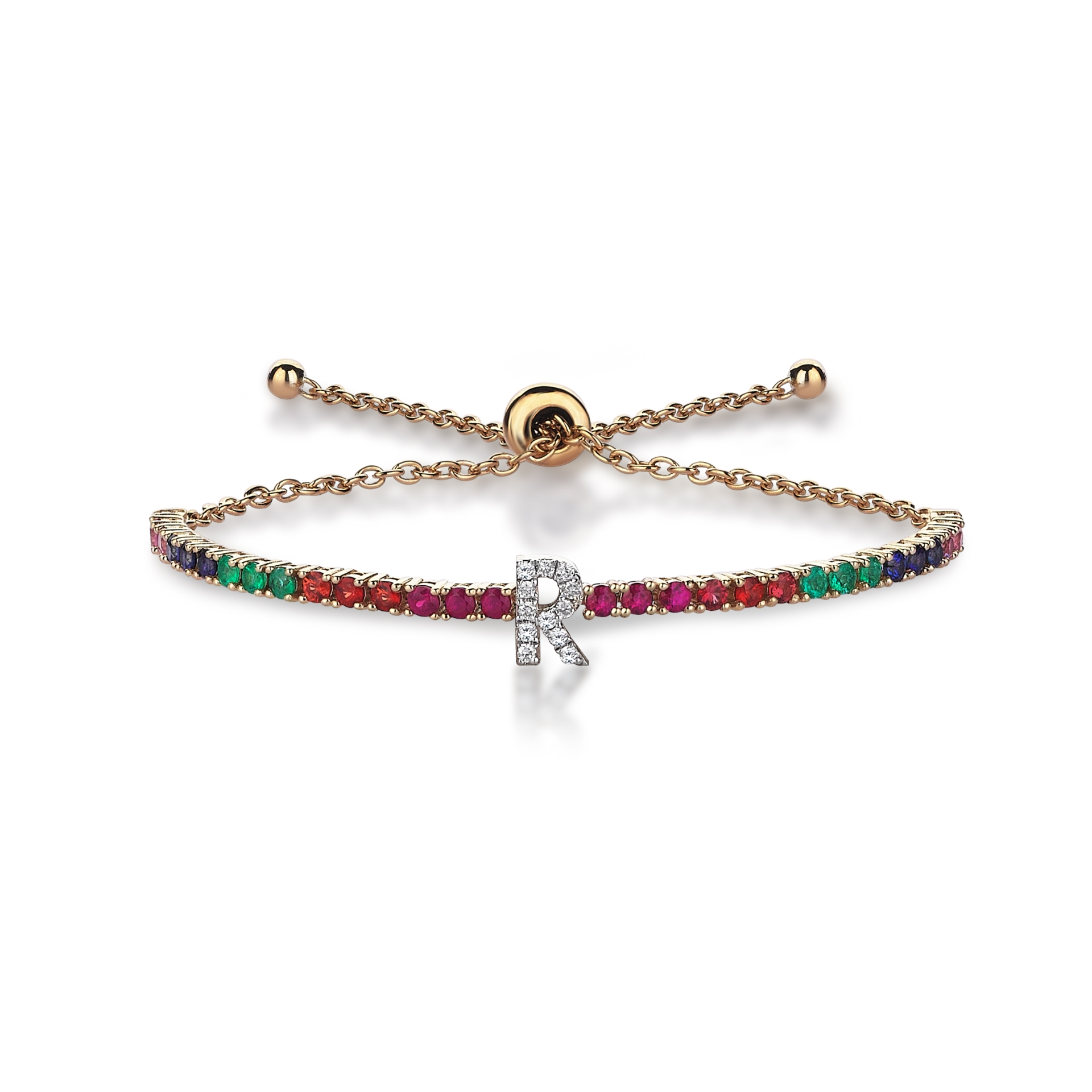 14 ayar altın Rainbow Pırlanta Harf Bilezik, gökkuşağının canlı renklerini yansıtan safir, zümrüt, yakut ve diğer değerli taşlarla süslenmiştir. Merkezde yer alan pırlanta kaplı. Merkezinde yer alan R harfi, kişisel bir dokunuş katarken, bileziğin zarif tasarımı her anınıza şıklık katıyor. Gökkuşağı, zorluklardan sonra gelen aydınlığı, umudu ve yeni başlangıçları simgeler.